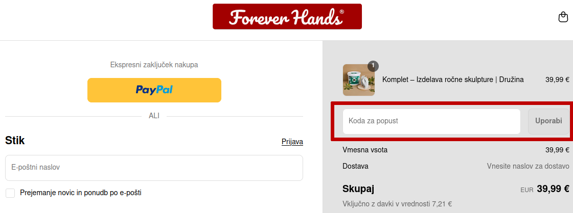 V spletni trgovini izberite izdelke, nadaljujte s plačilom in v polje z oznako "Koda za popust" vnesite kopirano kodo s portala Tipli.si ter potrdite s klikom na "Uporabi". Nato naročilo zaključite kot običajno. ForeverHands koda za popust